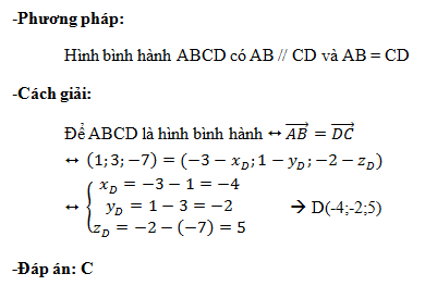 Trong không gian với hệ trục tọa độ Oxyz, cho điểm A(1;0;3), B(2;3;-4),C(-3;1;-2).Xét điểm D sao cho tứ giác ABCD là hình bình hành. Tìm tọa độ D