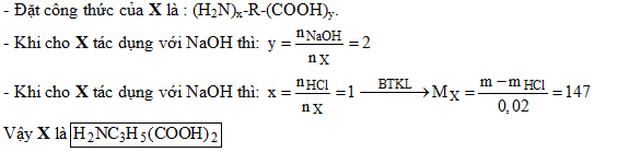 Cho 0,02 mol amino axit X tác dụng vừa đủ với 200 ml dung dịch HCl 0,1M thu được 3,67 gam muối khan. Mặt khác 0,02 mol X tác dụng vừa đủ với 40 gam dung dịch NaOH 4%. Công thức của X có thể là :