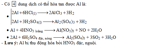 Cho Al tác dụng với lần lượt các dung dịch axit sau: HCl; HNO3 loãng; H2SO4 đặc, nóng; HNO3 đặc, nguội; H2SO4 loãng. Số dung dịch có thể hòa tan được Al là: