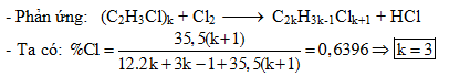 Clo hóa PVC thu được một polime chứa 63,96% clo về khối lượng, trung bình 1 phân tử clo phản