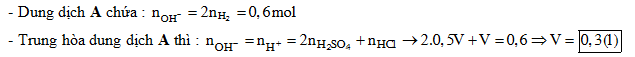 Cho m gam hỗn hợp Na, Ba vào nước thu được dung dịch A và 6,72 lít khí (đkc). Thể tích dung dịch hỗn hơp H2SO4 0,5M và HCl 1M cần dùng để trung hòa dung dịch A là :