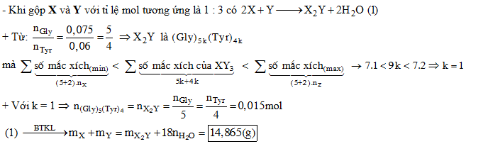 Hỗn hợp A gồm một peptit X và một peptit Y (mỗi chất được cấu tạo từ 1 loại aminoaxit, tổng số nhóm -CO-NH- trong 2 loại phân tử là 5) với tỉ lệ số mol nX : nY = 2 : 1. Khi thủy phân hoàn toàn m gam hỗn hợp A thu được 5,625 gam glyxin và 10,86 gam tyrosin. Gía trị của m là: