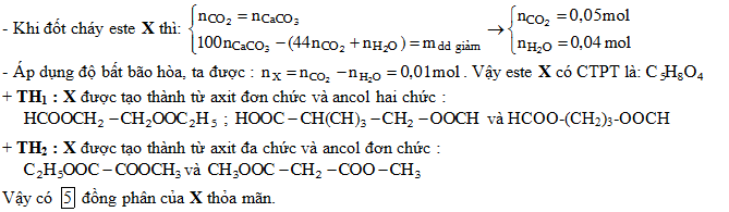 Đốt cháy hoàn toàn một este no 2 chức mạch hở X. Sục toàn bộ sản phẩm cháy vào dung dịch Ca(OH)2 dư, sau phản ứng thu được 5,0 gam kết tủa và khối lượng dung dịch giảm 2,08 gam. Biết khi xà phòng hóa X chỉ thu được muối của axit cacboxylic và ancol. Số đồng phân của X là: