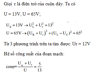 vào hai đầu đoạn mạch thì điện áp hiệu dụng ở hai đầu điện trở, hai đầu cuộn dây, hai đầu tụ điện lần lượt là 13 V, 13 V, 65 V. Hệ số công suất của đoạn mạch bằng