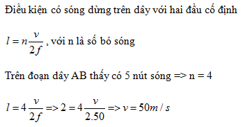 Dây AB căng ngang dài 2 m, hai đầu A và B cố định, tạo một sóng dừng trên dây với tần số 50 Hz, trên đoạn AB thấy có 5 nút sóng. Tốc độ truyền sóng trên dây là