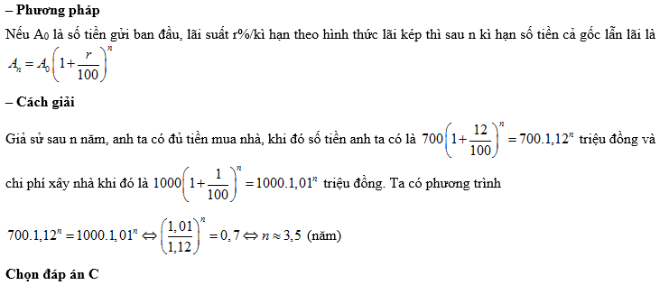 Anh A muốn xây một căn nhà. Chi phí xây nhà hết 1 tỉ đồng, hiện nay anh A có 700 triệu đồng. Vì không muốn vay tiền nên anh A quyết định gửi số tiền 700 triệu đồng vào ngân hàng với lãi suất 12% 1 năm, tiền lãi của năm trước được cộng vào tiền gốc của năm sau. Tuy nhiên giá xây dựng cũng tăng mỗi năm 1% so với năm trước. Hỏi sau bao lâu anh A sẽ tiết kiệm đủ tiền xây nhà ? ( Kết quả lấy gần đúng đến 1 chữ số thập phân)