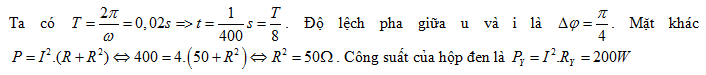 Đặt điện áp xoay chiều u = 400cos100πt (u tính bằng V, t tính bằng s) vào hai đầu đoạn mạch AB gồm điện trở R mắc nối tiếp với đoạn mạch Y. Cường độ dòng điện hiệu dụng qua mạch là 2A. Biết ở thời điểm t, điện áp tức thời hai đầu mạch AB có giá trị 400V, ở thời điểm t + 1/400 (s) cường độ dòng điện tức thời qua mạch là