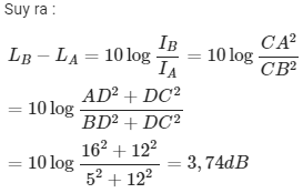 Từ điểm A bắt đầu thả rơi tự do một nguồn phát âm có công suất không đổi. Khi chạm đất tại B nguồn âm đứng yên luôn. Tại C ở khoảng giữa A và B (nhưng không thuộc AB) có một máy M đo mức cường độ âm, C cách AB 12m. Biết khoảng thời gian từ khi thả nguồn đến khi máy M thu được âm có mức cường độ âm cực đại, lớn hơn 1,528 (s) so với khoảng thời gian từ đó đến khi máy M thu được âm có mức cường độ âm không đổi, đồng thời hiệu 2 khoảng cách tương ứng này là 11m. Bỏ qua sức cản không khí, lấy g = 10m/s2. Hiệu giữa mức cường độ âm cuối cùng và đầu tiên có giá trị gần giá trị nào nhất sau đây?