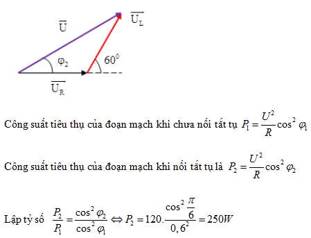 Đặt điện áp xoay chiều ổn định vào hai đầu đoạn mạch AB nối tiếp gồm điện trở thuần R, cuộn dây và tụ điện C. Khi đó đoạn mạch AB tiêu thụ công suất 120 W và có hệ số công suất là 0,6. Nếu nối tắc tụ C thì điện áp ở hai đầu điện trở R và hai đầu cuộn dây có cùng giá trị hiệu dụng nhưng lệch pha nhau p/3 . Công suất tiêu thụ của đoạn mạch lúc này là