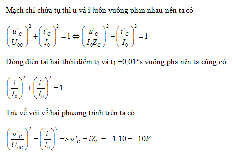 Một đoạn mạch điện xoay chiều tần số 50 Hz chỉ có tụ điện có dung kháng 10 Ω. Nếu tại thời điểm t1 cường độ dòng điện qua đoạn mạch là – 1 A thì tại thời điểm t1+ 0,015s điện áp hai đầu tụ điện