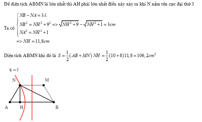 Tại mặt chất lỏng có hai nguồn phát sóng A, B giống nhau và cách nhau một đoạn 10 cm. Gọi M và N là hai điểm thuộc mặt chất lỏng sao cho =MN 8 cm và ABMN là hình thang cân (AB song song với MN). Bước sóng của sóng trên mặt chất lỏng do hai nguồn phát ra là 1 cm. Để trong đoạn MN có 7 điểm dao động với biên độ cực đại thì diện tích lớn nhất của hình bình hành là