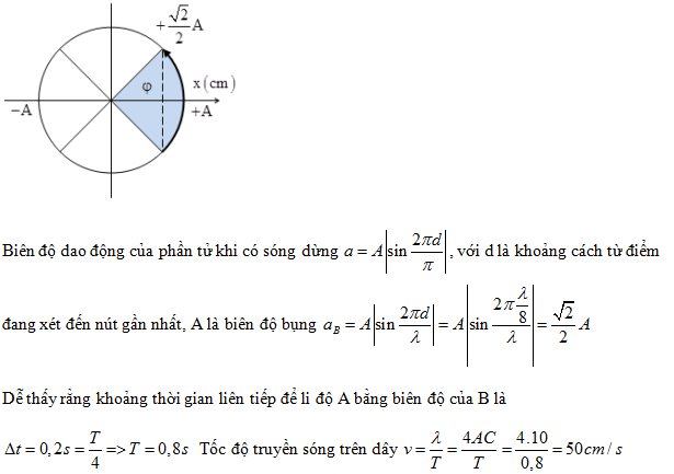Trên một sợi dây căng ngang đang có sóng dừng. Xét ba điểm A, B và C với B là trung điểm của đoạn AC. Điểm A cách điểm nút C một đoạn gần nhất 10 cm. Khoảng thời gian ngắn nhất để hai lần liên tiếp điểm A có li độ bằng biên độ dao động của điểm B là 0,2 s. Tốc độ truyền sóng trên dây là