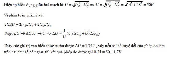 Trong giờ thực hành một dùng sinh dùng vôn kế lí tưởng để đo điện áp hai đầu R và tụ C của một đoạn mạch R, C nối tiếp. Kết quả đo được là UR = 14 ± 1,0V ,U = 48 ± 1,0V. Điện áp hai đầu đoạn mạch là