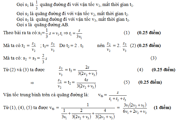 Một người đi từ A đến B. 1/3 quãng đường đầu người đó đi với vận tốc v1, 2/3 thời gian còn lại đi với vận tốc v2. Quãng đường cuối đi với vận tốc v3. Tính vận tốc trung bình của người đó trên cả quãng đường?
