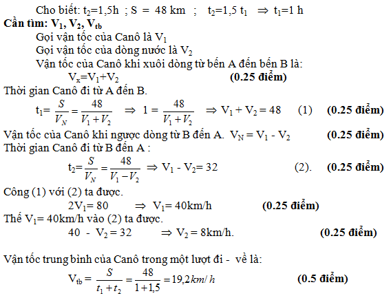Một chiếc Canô chuyển động theo dòng sông thẳng từ bến A đến bến B xuôi theo dòng nước. Sau đó lại chuyển động ngược dòng nước từ bến B đến bến A. Biết rằng thời gian đi từ B đến A gấp 1,5 lần thời gian đi từ A đến B (nước chảy đều). Khoảng cách giữa hai bến A, B là 48 km và thời gian Canô đi từ B đến A là 1,5 giờ. Tính vận tốc của Canô, vận tốc của dòng nước và vận tốc trung bình của Canô trong một lượt đi về?