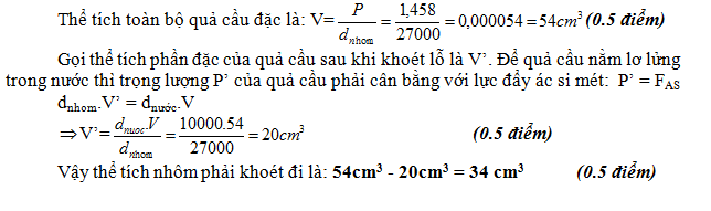 Một quả cầu đặc bằng nhôm, ở ngoài không khí có trọng lượng 1,458N. Hỏi phải khoét lõi quả cầu một phần có thể tích bao nhiêu để khi thả vào nước quả cầu nằm lơ lửng trong nước? Biết dnhôm = 27 000N/m3, dnước =10 000N/m3.