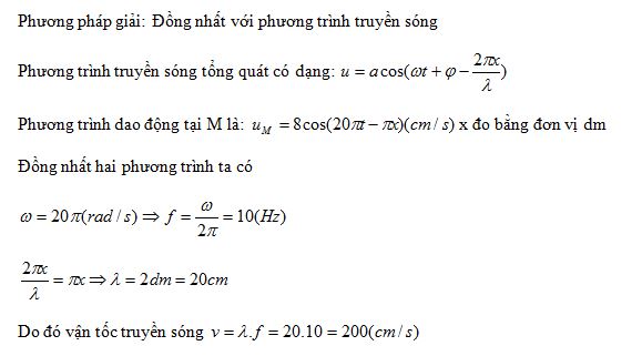 Một sóng cơ lan truyền trên bề mặt chất lỏng từ một nguồn O đến điểm M cách O khoảng x(dm). Biết phương trình dao động M là uM=8cos(20πt-πx) (cm/s) (trong đó t đo s). Tốc độ truyền sóng trên bề mặt chất lỏng bằng