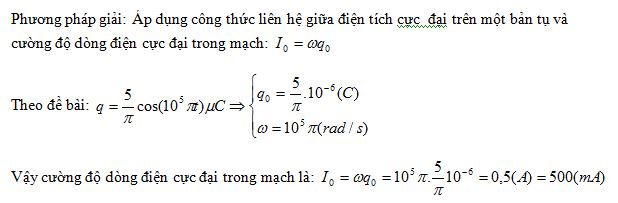 Một mạch LC đang có dao động điện từ tự do. Biết điện tích trên một bản tụ điện là \(q = \frac{5}{\pi }cos({10^5}\pi t)\,\,\mu C\) (trong đó t đo s). Cường độ dòng điện cực đại trong mạch này bằng