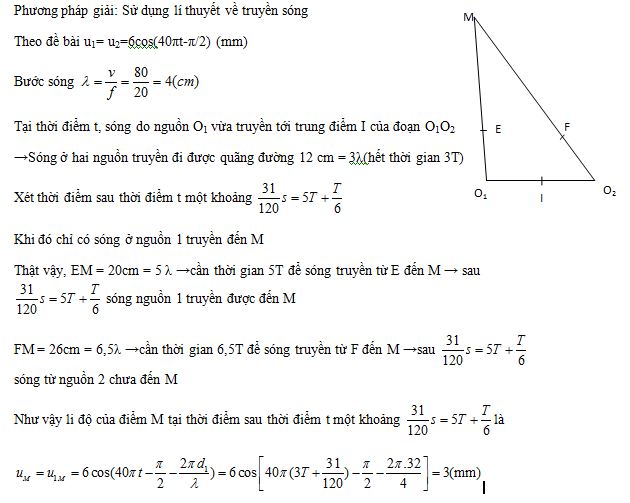 Trên bề mặt chất lỏng cho hai nguồn sóng O1, O2 cách nhau 24cm có phương trình lần lượt u1= u2=6cos(40πt-π/2) (mm). Cho tốc độ truyền sóng trên bề mặt chất lỏng 80(cm/s).kg. Xét phần tử phần tử M có vị trí cân bằng cách O1, O2 lần lượt 32(cm) và 38(cm). Li độ của M sau thời điểm t một khoảng