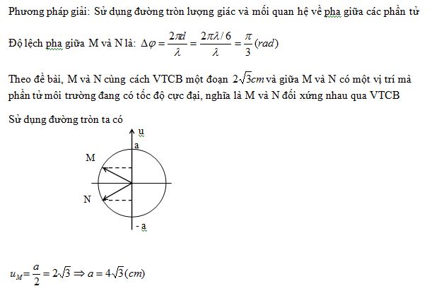 Một sóng cơ lan truyền trên một phương với biên độ A không suy giảm và bước sóng λ. Xét hai phần tử M và N nằm trên phương truyền sóng có vị trí cân bằng cách nhau một khoảng λ/6. Tại thời điểm t nào đó phần tử M và N cùng cách vị trí cân bằng của nó một khoảng 2√3(cm); và giữa M, N có một vị trí mà phần tử môi trường đang có tốc độ cực đại. Biên độ sóng bằng