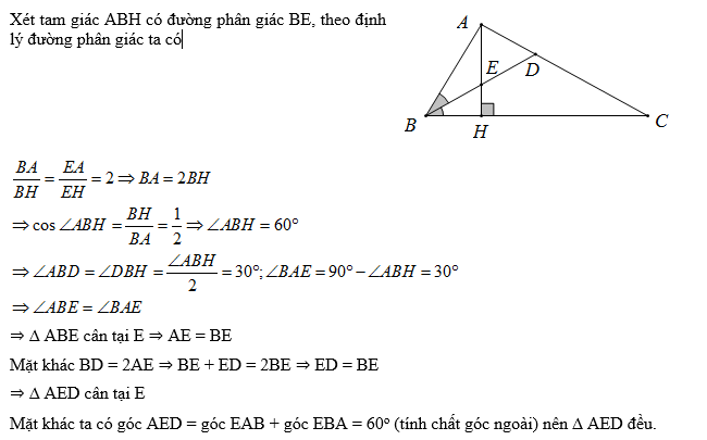 Cho tam giác ABC không tù ,có đường cao AH và phân giác BD của góc ABC cắt nhau tại E sao cho AE = 2EH , BD = 2AE. Chứng minh rằng tam giác ADE đều