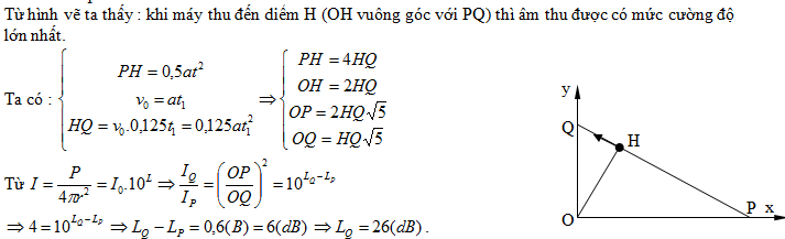 Tại vị trí O trong trên mặt đất có một nguồn âm điểm phát âm đẳng hướng ra không gian với công suất không đổi. Hai điểm P và Q lần lượt trên mặt đất sao cho OP vuông góc với OQ. Một thiết bị xác định mức cường độ âm M bắt đầu chuyển động thẳng với gia tốc a không đổi từ P hướng đến Q, sau khoảng thời gian t1 thì M đo được mức cường độ âm lớn nhất; tiếp đó M chuyển động thẳng đều và sau khoảng thời gian 0,125t1 thì đến điểm Q. Mức cường độ âm đo được tại P là 20 dB. Mức cường độ âm tại Q mà máy đo được là