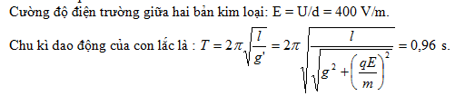 Một con lắc đơn dài 25cm, hòn bi có khối lượng 10 g mang điện tích q = 10-4C. Lấy g = 10 m/s2. Treo con lắc đơn giữa hai bản kim loại song song thẳng đứng cách nhau 20cm. Đặt hai bản dưới hiệu điện thế một chiều 80V. Chu kì dao động của con lắc đơn với biên độ góc nhỏ là