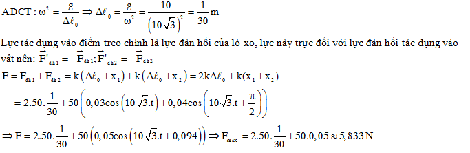 cm (t tính bằng s). Biết lò xo có độ cứng k = 50 N/m, gia tốc trọng trường g = 10 m/s2. Hợp lực do hai con lắc tác dụng lên giá đỡ trong quá trình dao động có độ lớn cực đại là