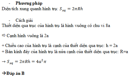 Thiết diện qua trục của một hình trụ là hình vuông có chu vi là 8a. Diện tích xung quanh của