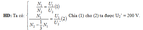 Đặt vào hai đầu cuộn sơ cấp của máy biến áp lí tưởng một điện áp xoay chiều có giá trị hiệu dụng không đổi thì điện áp hiệu dụng hai đầu cuộn thứ cấp để hở là 300 V. Nếu giảm bớt một phần ba tổng số vòng dây của cuộn thứ cấp thì điện áp hiệu dụng hai đầu của nó là