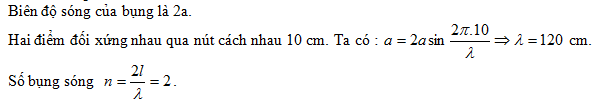Một sợi dây AB đàn hồi căng ngang dài 120 cm, hai đầu cố định đang có sóng dừng ổn định. Bề rộng của bụng sóng là 4a. Khoảng cách giữa hai điểm đối xứng nhau qua điểm nút dao động cùng biên độ bằng a là 20 cm. Số bụng sóng trên AB là