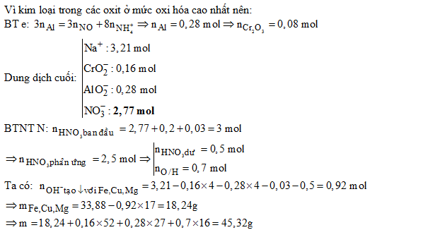 Trộn hỗn hợp gồm Fe2O3, CuO, Cr2O3 (2x mol), MgO với bột Al (7x mol) được hỗn hợp H. Nung hỗn hợp H một thời gian được m gam hỗn hợp X. Cho toàn bộ X tác dụng hết với dung dịch HNO3 (dùng dư 20% so với lượng phản ứng), thu được 4,48 lít khí NO (đktc) và dung dịch Y. Nhỏ từ từ dung dịch NaOH (loãng) 2,14M vào Y đến khi không còn phản ứng xảy ra thì vừa hết 1,5 lít, sau phản ứng thu được 0,03 mol khí và 33,88g kết tủa. Giá trị của m là