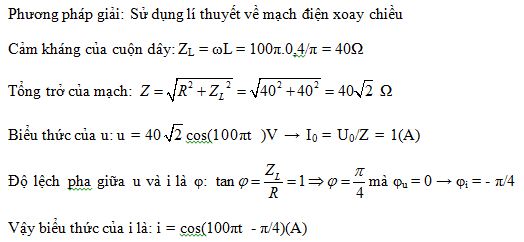 Cho đoạn mạch xoay chiều gồm R, L mắc nối tiếp có R = 40 Ω, L = 0,4/π (H) . Đoạn mạch được mắc vào áp u = 40 cos(100πt )V. Biểu thức cường độ dòng điện chạy qua mạch là