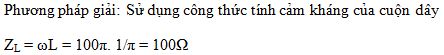 Đặt vào hai đầu cuộn cảm thuần có độ tự cảm L = 1/π (H) một điện áp xoay chiều u = U0 cos(100πt) (V). Cảm kháng của cuộn dây bằng