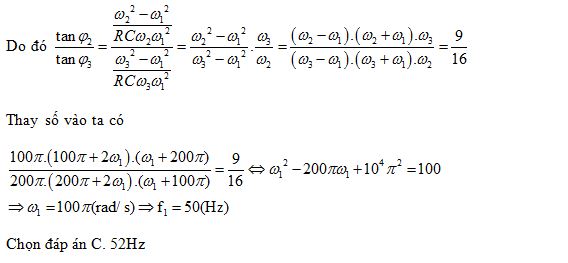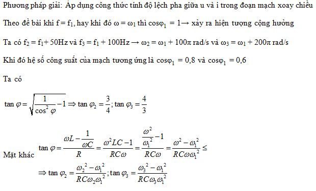 Đoạn mạch AB gồm điện trở R, cuộn cảm thuần L và tụ điện C mắc nối tiếp. Đặt điện áp u = U0cos(2πft) vào hai đầu đoạn mạch AB. Cho biết R, L, C, U0 là các giá trị dương và không đổi, tần số f thay đổi được. Thay đổi f thì nhận thấy f = f1 (Hz) , f = f1 + 50 Hz , f = f1 + 100 Hz thì hệ số công suất của đoạn mạch lần lượt là cosφ1 = 1; cosφ2 = 0,8; cosφ3 = 0,6 . Giá trị f1 gần giá trị nào nhất sau đây?