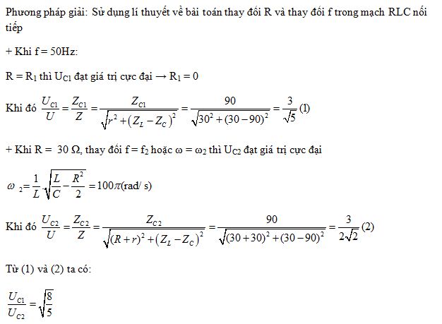 F, cuộn dây có r = 30Ω, độ tự cảm L = 0,3/π H và biến trở R mắc nối tiếp. Khi cố định giá trị f = 50Hz và thay đổi R = R1 thì UC1 đạt giá trị cực đại. Khi cố định giá trị R = 30 Ω thì và thay đổi f = f2 thì UC2 đạt giá trị cực đại. Tỉ số giữa UC1/ UC2 bằng