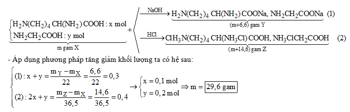 Hỗn hợp X gồm glyxin và lysin. Cho m gam X tác dụng hoàn toàn với dung dịch NaOH dư, thu được dung dịch Y chứa (m + 6,6) gam muối. Mặt khác nếu cho m gam X tác dụng hoàn toàn với dung dịch HCl, thu được dung dịch Z chứa (m + 14,6) gam muối. Giá trị của m là