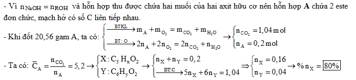 Cho hỗn hợp A gồm 2 chất hữu cơ mạch hở X, Y (chỉ chứa C, H, O và MX < MY) tác dụng vừa đủ với 200 ml dung dịch NaOH 1M, thu được 0,2 mol một ancol đơn chức và 2 muối của hai axit hữu cơ đơn chức, kế tiếp nhau trong dãy đồng đẳng. Mặt khác đốt cháy 20,56 gam A cần 1,26 mol O2 thu được CO2 và 0,84 mol H2O. Phần trăm số mol của X trong A là