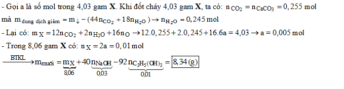 Đốt cháy hoàn toàn 4,03 gam triglixerit X bằng một lượng oxi vừa đủ, cho toàn bộ sản phẩm cháy hấp thụ hết vào bình đựng nước vôi trong dư thu được 25,5 gam kết tủa và khối lượng dung dịch thu được giảm 9,87 gam so với khối lượng nước vôi trong ban đầu. Mặt khác, khi thủy phân hoàn toàn 8,06 gam X trong dụng dịch NaOH (dư) đun nóng, thu được dung dịch chưa a gam muối. Giá trị của a là