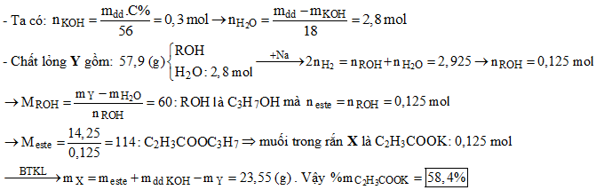 Xà phòng hóa hoàn toàn 14,25 gam este đơn chức, mạch hở với 67,2 gam dung dịch KOH 25%, chưng cất dung dịch sau phản ứng, thu được phần rắn X và 57,9 gam chất lỏng Y. Dẫn toàn bộ Y qua bình đựng Na dư, thấy thoát ra 32,76 lít khí H2 (đktc). Phần trăm khối lượng của muối trong rắn X là