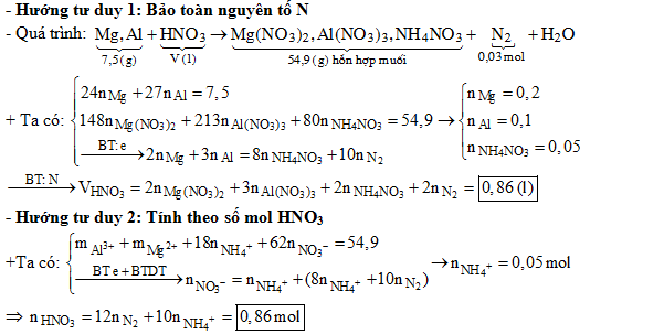 Hòa tan hoàn toàn 7,5 gam hỗn hợp gồm Mg và Al bằng lượng vừa đủ V lít dung dịch HNO3 1M. Sau