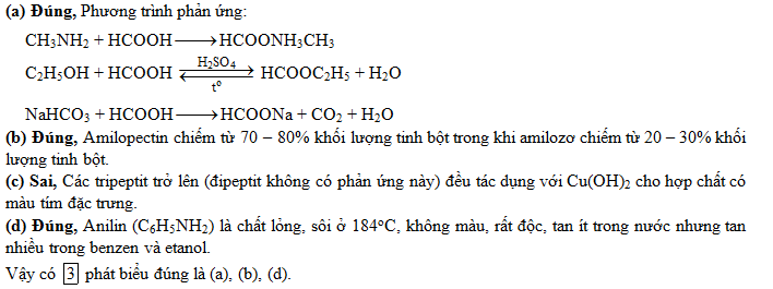 Cho các phát biểu sau: (a) Các chất CH3NH2, C2H5OH, NaHCO3 đều có khả năng phản ứng với
