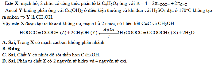 Este hai chức, mạch hở X có công thức phân tử C6H6O4 và không tham gia phản ứng tráng bạc. X được tạo thành từ ancol Y và axit cacboxyl Z. Y không phản ứng với Cu(OH)2 ở điều kiện thường; khi đun Y với H2SO4 đặc ở 170oC không tạo ra anken. Nhận xét nào sau đây đúng