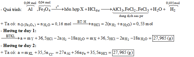 Trộn 2,43 gam Al với 9,28 gam Fe3O4 rồi nung nóng cho phản ứng xảy ra một thời gian, làm lạnh được hỗn hợp X gồm Al, Fe, Al2O3, FeO và Fe3O4. Cho toàn bộ X phản ứng với dung dịch HCl dư thu được 2,352 lít H2 (đktc) và dung dịch Y. Cô cạn Y được a gam muối khan. Xác định giá trị của a là