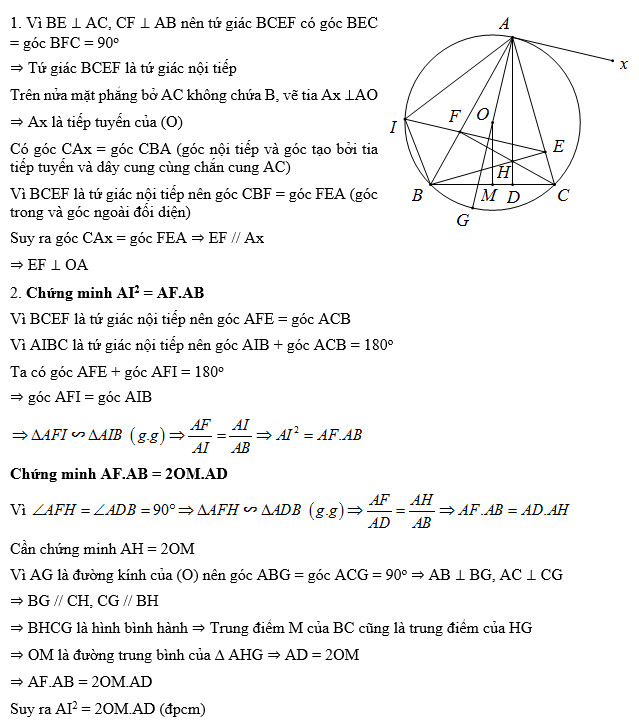 1. Chứng minh tứ giác BCEF là tứ giác nội tiếp và AO vuông góc với EF