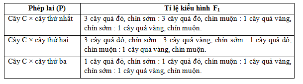 Ở một loài thực vật, alen A quy định hoa đỏ trội hoàn toàn so với alen a quy định hoa vàng; alen B quy định quả chín sớm trội hoàn toàn so với alen b quy định quả chín muộn. Lai cây (C) của loài này với 3 cây khác cùng loài, thu được kết quả sau: