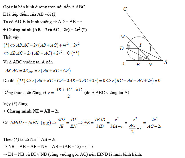Cho tam giác ABC vuông tại A có AB < AC. Đường tròn tâm I nội tiếp tam giác ABC và tiếp xúc với cạnh AC tại D. Gọi M là trung điểm AC, đường thẳng IM cắt AB tại N. Chứng minh tứ giác IBND là hình bình hành.