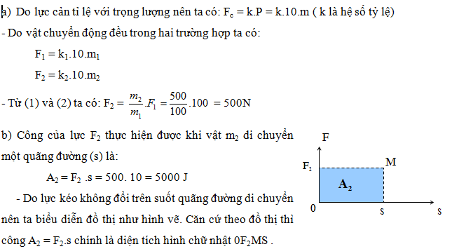 b) Tính công của lực để vật m2 đi được đoạn đường s = 10m. dùng đồ thị diễn tả lực kéotheo quãng đường di chuyển để biểu diễn công này.