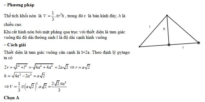Một hình nón có đường sinh bằng 2a và thiết diện qua trục là tam giác vuông. Tính thể tích V của khối nón.