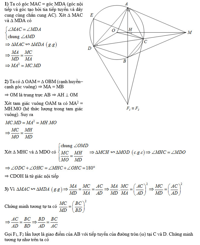 Từ điểm M nằm ngoài đường tròn (ω) tâm O, vẽ đến (ω) hai tiếp tuyến MA, MB và cát tuyến MCD, C nằm giữa M và D. Gọi H là giao điểm MO và AB